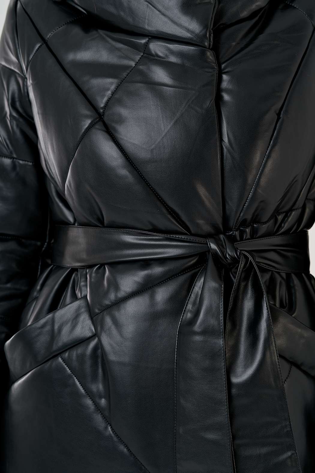 Пуховое пальто из эко кожи будет радовать вас осенью и зимой. Изделие из водонепроницаемого материала. Утеплитель - верблюжья шерсть. Объемный капюшон заменит шапку и укроет от ветра. Застегивается на молнию и кнопки, также есть пояс.